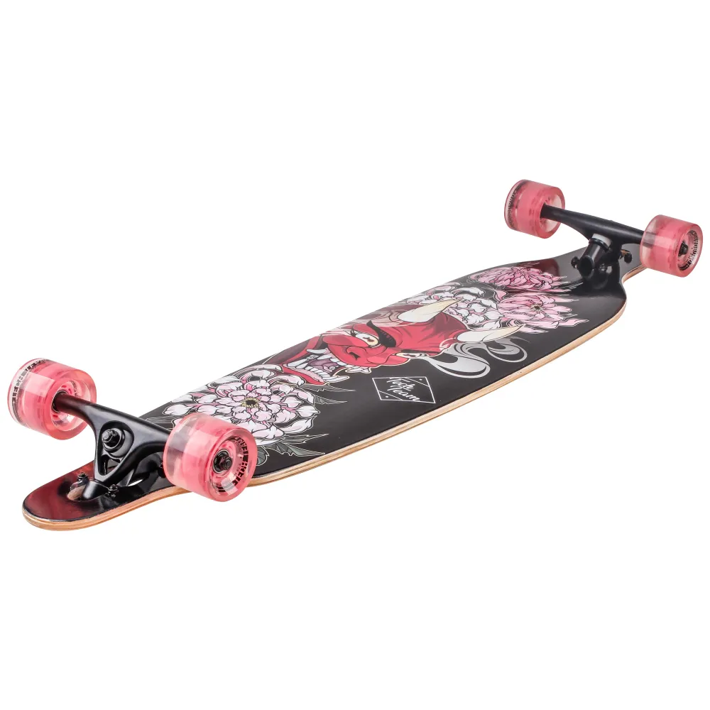Дека имеет размеры 41 дюйм. Покрыта нескользящей брендовой шкуркой. Верхняя часть обозначена фирменным принтом. 7-дюймовая подвеска из высокопрочного алюминия качественная, проверена многочисленными отзывами райдеров. Колеса диаметром 70 мм, шириной 51 мм и параметрами жесткости 82А изготовлены из нестираемого долговечного материала. Вместе с подшипниками ABEC 7 CHROME и бушингами жесткостью 95 А езда превращается в удовольствие. Технические параметры модели позволяют развлекаться и маневрировать. Для заказа лонгборда предлагаем связаться с менеджером интернет-магазина.