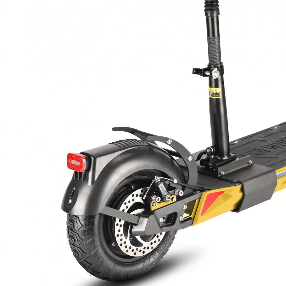 Большие колеса 11 дюймов изготовлены из резины и имеют надувную конструкцию. Широкий протектор обеспечивает лучшее сцепление с дорожным полотном. Амортизация доведена до совершенства и позволяет не замечать ямы и кочки. Широкое сидение рассчитано на длительные поездки. Яркий передний свет и оригинальные габаритные огни делают поездки безопасными. Тормоза дисковые имеют независимы друг от друга на каждом колесе и хорошо реагируют на команды. Современный боровой компьютер отображает основные параметры электросамоката, такие как скорость и уровень заряда.