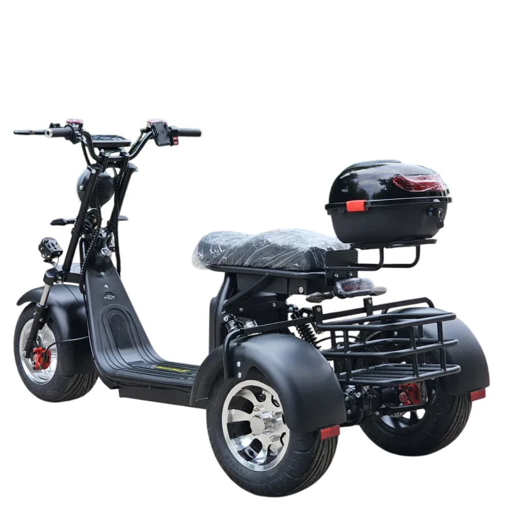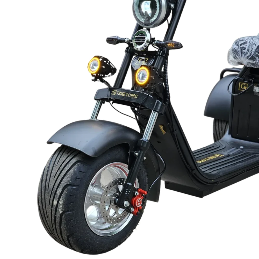 Электроскутер трехколесный CITYCOCO GT X11 TRIKE 2023 в черном цвете - это инновационное транспортное средство, которое обеспечит вам комфортное и стильное передвижение по городским улицам.