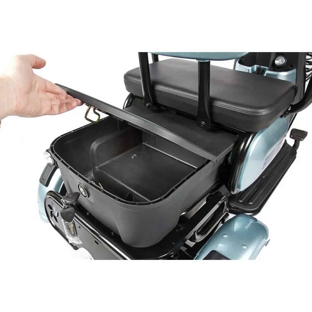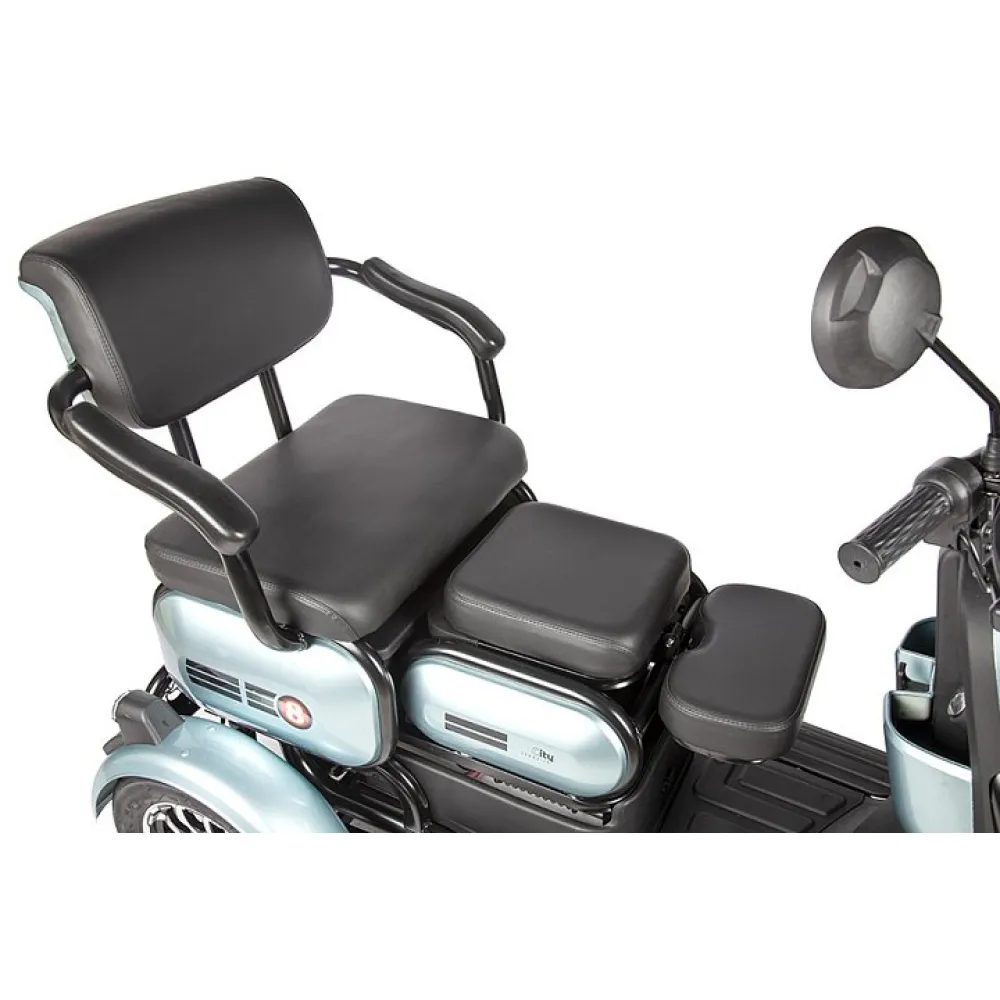 Модель с мощностью 500 Вт без труда развивает скорость до 25 км/час и преодолевает 30 км пути. Мягкое объемное сиденье повторяет анатомические части тела, не вызывает усталости, снижает нагрузку с позвоночника. Имеется дополнительное сиденье, которое чаще используется для катания детей.