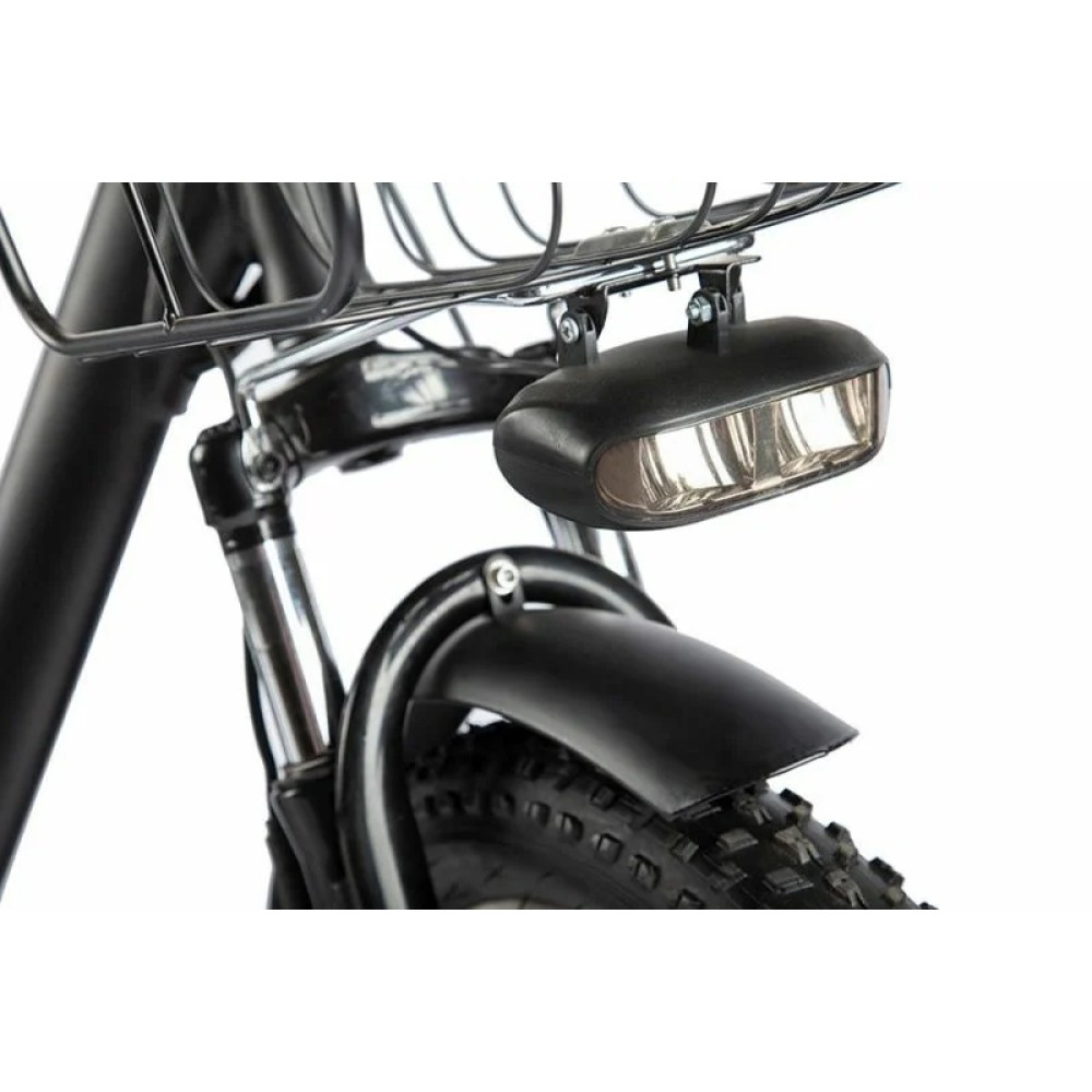 Работает от аккумуляторной батареи, которая долго держит заряд, можно проехать до 40 км. Имеет стильные светодиодные фары, стальные полноразмерные крылья. Впереди на руле расположена легкая корзина, сзади – большая вместительная.