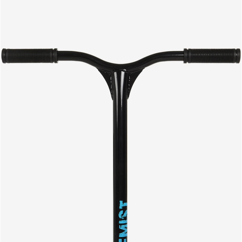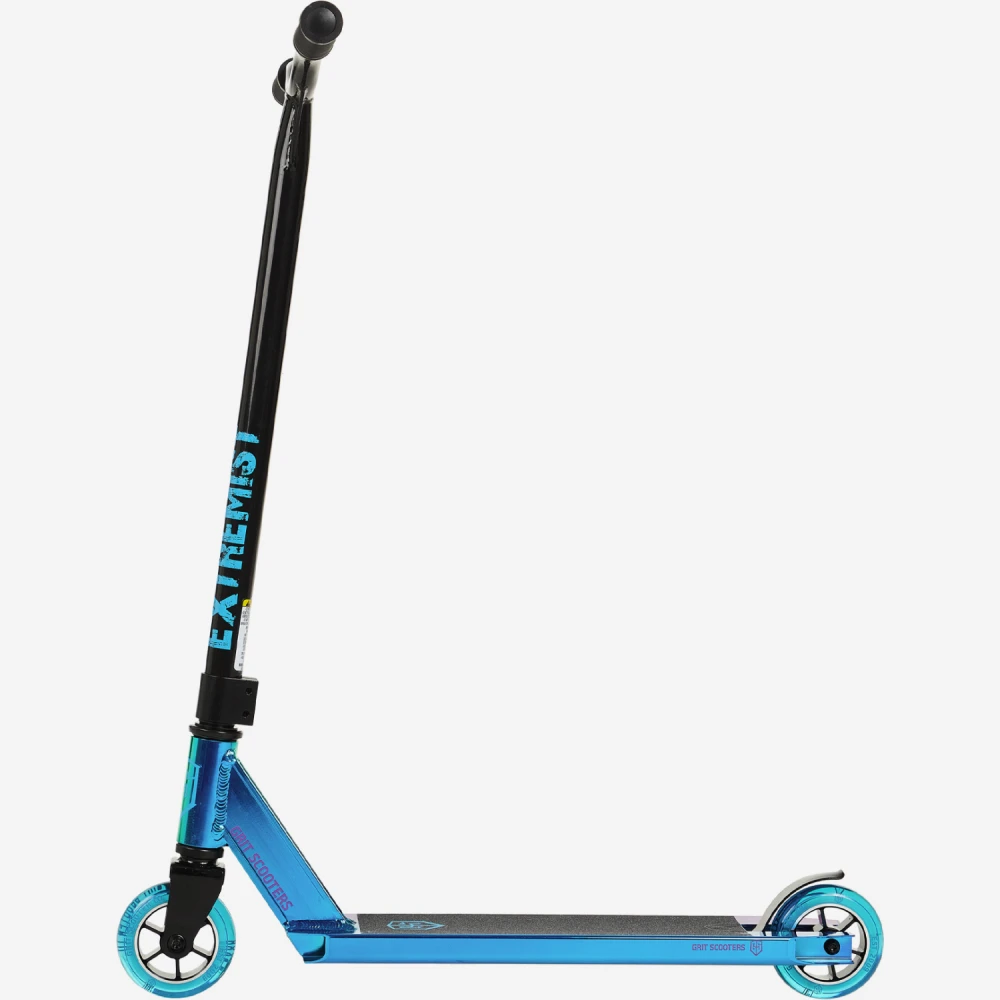 Трюковой самокат Grit Extremist, 100 мм синий хром выглядит круто и дорого. Модель предназначена для активных трюкачей, для которых на лидирующих позициях находится высокое качество исполнения прыжков, опасная маневренность и выброс адреналина.
